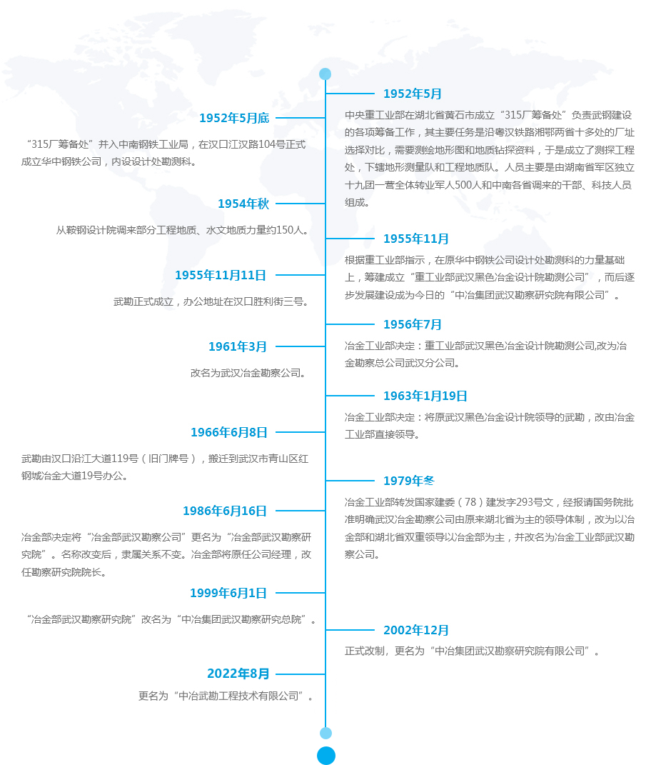 中冶武勘工程技術有限公司是隨著我國第二個鋼鐵工業(yè)基地—武漢鋼鐵公司的建立而發(fā)展起來的。